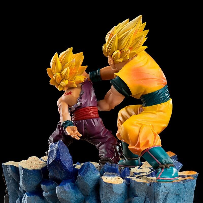 La figurine est très détaillée, avec une grande attention portée aux expressions des visages et aux détails des vêtements. Goku porte son célèbre gi orange avec une ceinture bleue, tandis que Gohan porte son uniforme de l’école. Les deux personnages ont des cheveux noirs ébouriffés et des yeux noirs intenses.