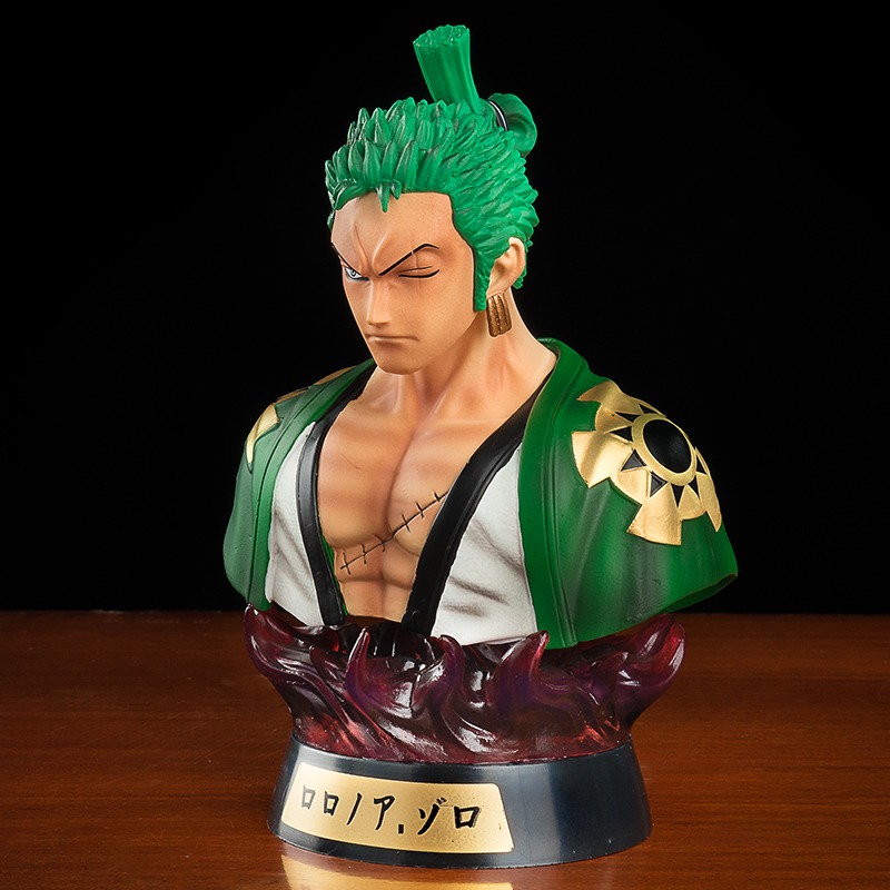 Figurine One Piece Roronoa Zoro mesure 23 cm de hauteur et est fabriquée en PVC de haute qualité. Elle illustre uniquement la partie supérieure de Zoro, montrant son torse, ses bras et sa tête. Les vêtements de Zoro sont représentés dans sa tenue verte emblématique, avec des détails minutieux tels que les boutons et les coutures. Ses cheveux sont coiffés vers le haut, comme dans la série animée.